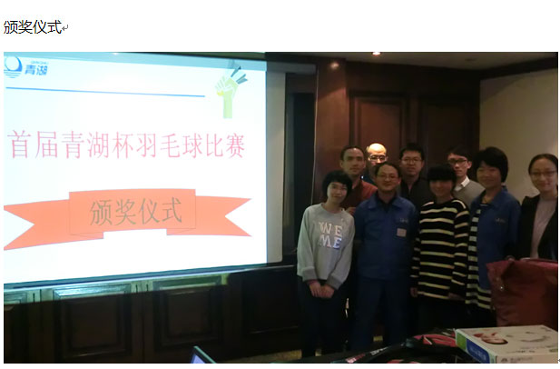 為豐富員工業(yè)余文化生活,增進(jìn)員工之間的交流,給來(lái)自不同部門的同事搭建八小時(shí)之外的良好溝通平臺(tái),促進(jìn)“和諧青湖、健康青湖、快樂(lè)青湖”建設(shè),2014年11月9日公司在雅戈?duì)栿w育館組織了首屆“青湖杯“羽毛球比賽。本著“我運(yùn)動(dòng)、我健康、我快樂(lè)”的目的,來(lái)自PMC部、質(zhì)量部、IT部、客服部、人事部等員工踴躍報(bào)名參與,攜手并肩向快樂(lè)出發(fā)。